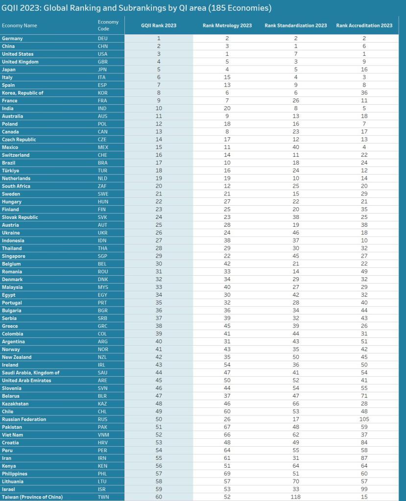 The GQII 2023 ranks 185 countries according to the relative development of their QI. A formula calculates a score for each country based on its position in the sub-rankings for metrology, standards and accreditation.